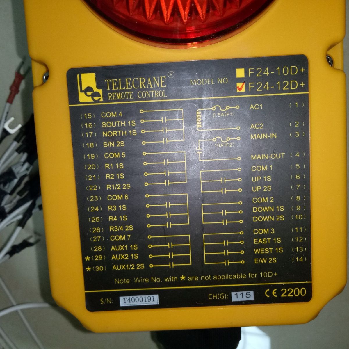 供應臺灣禹鼎telecrane 新品F24-12D+ 十二鍵雙速工業無線遙控器 品牌:臺灣禹鼎 型號:F24-12D+ 配件適用對象:塔吊 起重機 工程機械 工業自動化控制 詳細說明: 禹鼎工業遙控器F24-10D+ 產 品 性 能 指 標 十二只功能按鍵(二段式按鍵)+蘑菇頭急停+啟動鑰匙+備用 發射器(手持)尺寸:245x61x51mm(含天線) 重量:約246克 接收機 尺寸:234x116x130mm 重量:1240克(不含電纜線) 電壓:36/220/380VAC 一般規格: *操作溫度:-30~+85攝氏度 *最大操作距離:100米 *發射機電源:AA堿性電性×2 *收發機電源:AC48/110/220/380V(可選擇)DC 12~24V *防護等級:IP65 *識別碼:43位組不重復識別碼(32位元) *漢明碼:≥20 *尼能加織的強化塑膠外殼,可防止摔落及強力碰撞所造成之損壞 *IP65防水防塵等級。 *全系列硬件/軟件完全相容,可節省庫存支出 *低耗電(使用兩顆AA堿性電池平均使用壽命可達2個月) *可經由PC軟件設定多種按鍵功能(與Win98/ME/2000/XP相容),能完全滿足各種操作要 求 *接收機含輸出電纜線,安裝簡單、快速。 *多重安全保護設計:漢明碼、看門狗線路、32位元不重復識別碼。 適用于三機構雙速電動單梁起重機、雙梁橋式起重機、門式起重機、碼頭吊、懸臂吊等起重設備和其他三機構正反轉控制設備,以及10個開關量帶快慢速控制的液壓、氣動工業設備。