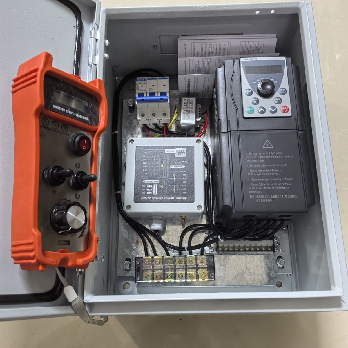 鹽城瑞久機(jī)電科技有限公司可為您定制工業(yè)無線遙控控制箱,通過遙控器在數(shù)百米甚至數(shù)千米外實(shí)現(xiàn)遠(yuǎn)距離無線控制控制箱內(nèi)的元器件動作,不但能夠?qū)崿F(xiàn)開關(guān)量動作,替代控制箱面板的按鈕開關(guān)、選擇開關(guān)、檔位開關(guān)還可以替代變頻器面板按鈕、旋鈕,實(shí)現(xiàn)模擬量的遠(yuǎn)距離控制,從而控制變頻電機(jī)的轉(zhuǎn)速、比例閥開度、焊接電流的大小、PWM脈寬等。通過遙控器面板的顯示屏、液晶屏、觸摸屏等還可以顯示被控對象的工作參數(shù)、工作狀態(tài)。接收機(jī)還可以接入PLC、中控系統(tǒng)、傳感器等設(shè)備,將現(xiàn)場控制信號、參數(shù)無線傳送至發(fā)射器,通過發(fā)射器面板的指示燈、蜂鳴器、液晶屏等傳遞給操作者。并實(shí)現(xiàn)各種順序、條件、運(yùn)算等復(fù)雜的邏輯控制。