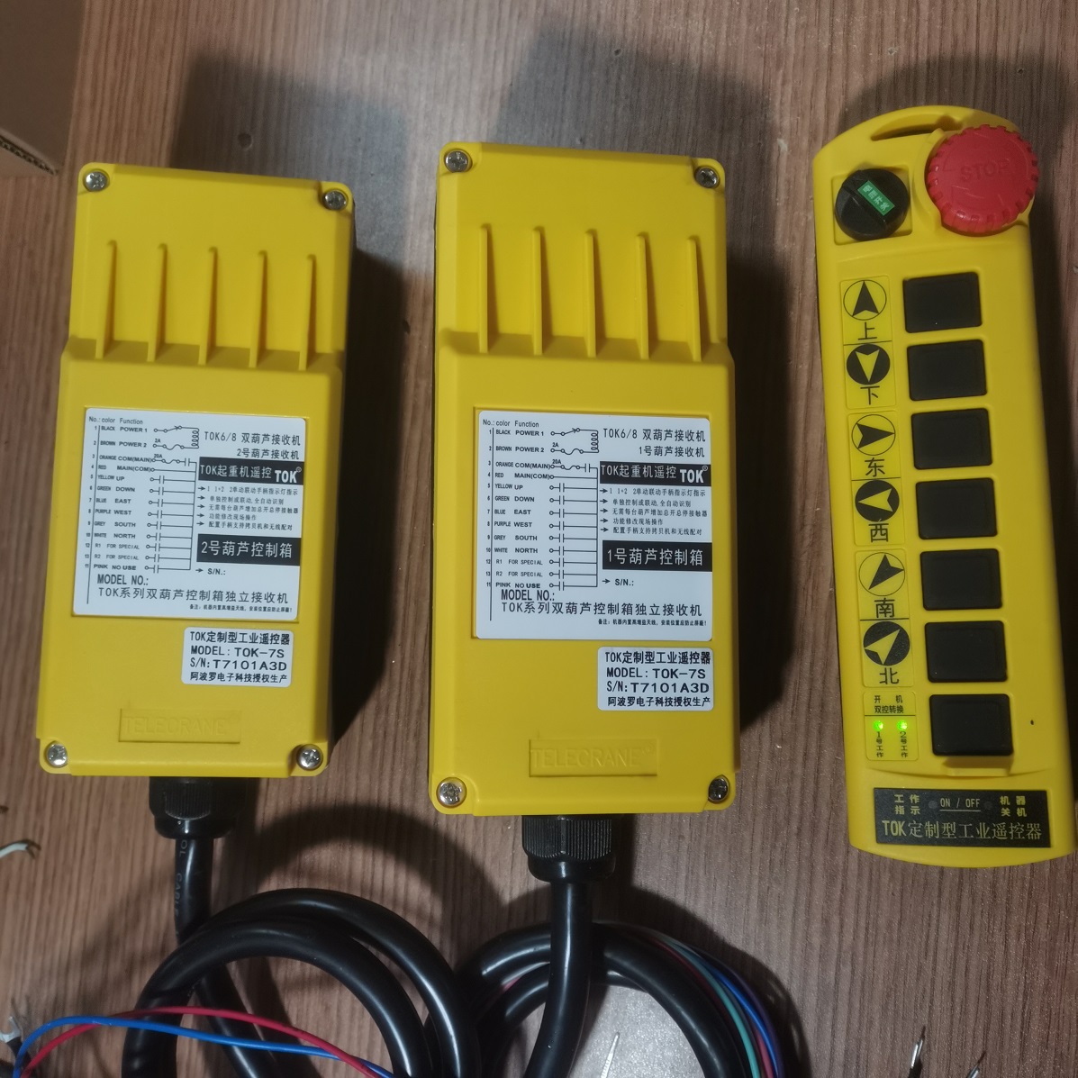 TOK-7S 七鍵工業遙控器 5顆操作按鍵+電源開關+歐規急停,適合三機構往復的設備如起重機大車左右、小車前后、吊鉤升降控制,三臺電動機的正反轉控制、三臺升降機、吊籃控制、或者六~七個設備點動控制,按鍵功能也可以設定為自鎖模式(就是第一次按一下,繼電器閉合,再按一下繼電器斷開),設定為自鎖的話就可以控制7臺電動機的啟停,或者7個電池閥的通斷,7盞燈的開關。也可以混合設定,就是部分按鈕設定為點動,部分按鍵設為自鎖,以實現更為復雜的控制功能。